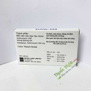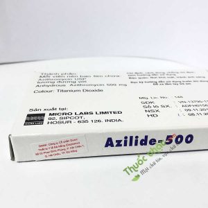 Thuocthat.com xin được giới thiệu tới mọi người thuốc điều trị nhiễm trùng hiệu quả Azilide 500mg, được sản xuất và phân phối bởi Công ty Micro Labs Limited, Ấn Độ. Với thành phần có trong thuốc là Azithromycine sẽ là một loại kháng sinh hiệu quả trong việc tiêu diệt các loại vi khuẩn gây bệnh, làm nhiễm trùng các bộ phân của cơ thể như là hệ hô hấp, nhiễm trùng đường tiểu và vài trường hợp khác nữa. Thuốc được nhiều chuyên gia, bác sĩ đánh giá rất cao hiệu quả của thuốc mang lại.