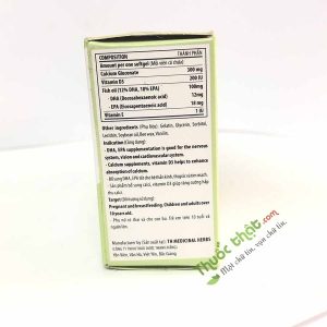 • THÀNH PHẦN Calcium gluconate 300mg,Vitamin D3 200 IU, Fish oil 100m, 12% DHA (Docosahexaenoic acid),18% EPA (Eicosapentaenoic acid ),Vitamin E (dl- tocopherol acetate) 1 IU