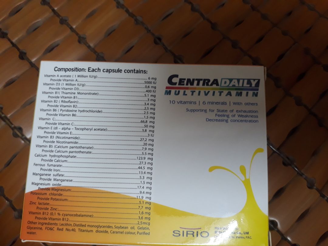 Thực phẩm chức năng bổ sung Vitamin Central Daily chứa thành phần Vitamin A, D3, B1, B2, B6, C, E, B3, B5… bổ sung các Vitamin và khoáng chất cần thiết cho cơ thể, tăng cường sức khỏe và sức đề kháng, giúp cơ thể phục hồi sức khỏe. Đồng thời sản phẩm giúp giảm các triệu chứng mệt mỏi, căng thẳng, cảm giác yếu sức, giúp tập trung trí lực, tỉnh táo tinh thần ở những người lao động nặng, hoạt động quá sức, làm việc áp lực.
