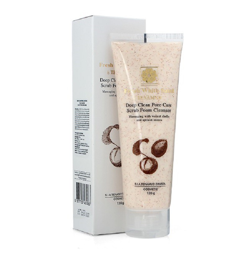 Sữa tẩy tế bào chết da mặt Fresh White Sand Tenamyd Deep Clean Pore Care Scrub Foam Cleanser Làm sạch sâu loại bỏ tất cả các bụi bẩn, bã nhờn, tạp chất trên da, giúp thông thoáng lỗ chân lông, làn da của bạn trở nên mịn màng trắng sáng ngay lần sử dụng đầu tiên. Sữa tẩy tế bào chết da mặt Fresh White Sand Tenamyd trên da mặt được nghiên cứu theo công thức mới, với chiết xuất từ bột của quả óc chó và quả mơ, hòa quyện cùng thành phần dầu khoáng chất Mineral Oil chứa các hạt massage tẩy tế bào chết nhẹ nhàng.