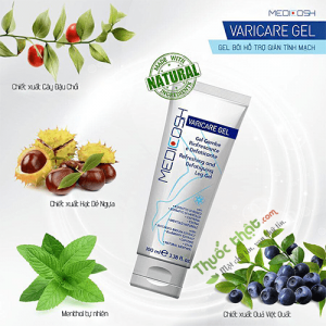 - Gel Medicosh Varicare hỗ trợ điều trị suy giãn tĩnh mạch hiệu quả, làm thuyên giảm các cảm giảm khó chịu đau nhức cho suy giãn tĩnh mạch gây ra, đồng thời giúp nuôi dưỡng làn da,mang lại cảm giác dễ chịu cho người sử dụng.