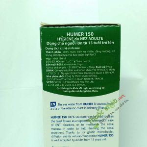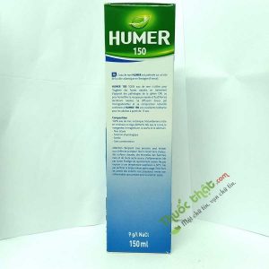 - HUMER 150 – Dung Dịch Sịt Rửa Mũi Chứa 100% Nước Biển Tự Nhiên : được sử dụng để vệ sinh khoang mũi hàng ngày, hỗ trợ điều trị hoặc phòng ngừa các bệnh tai mũi họng, hoặc để làm ẩm niêm mạc mũi trong trường hợp không khí khô, dành cho người lớn (từ 15 tuổi trở lên).