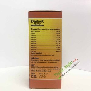 Siro Dailivit là vitamin tổng hợp được chiết xuất từ các thành phần chủ yếu là các vitamin: Royal Jelly, Vitamin E, Vitamin B1, Vitamin B2, Vitamin B6, Vitamin B3, Vitamin B5, Vitamin C, Vitamin B12; Vitamin B7; Folic acid… giúp cung cấp cho cơ thể các yếu tố cần thiết cho tăng trưởng của trẻ. Sản phẩm thích hợp sử dụng cho bé từ 2 tuổi trở lên.thuocthat.com tự tin mang đến cho bạn một sản phẩm đảm bảo chất lượng an toàn cho sức khỏe của bé.Bài viết dưới đây mang đầy đủ thong tin về sản phẩm mời bạn đọc tham khảo.