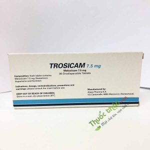 Thuốc Trosicam có tác dụng điều rất cao đối với những bệnh nhân viêm đau xương khớp, viêm khớp dạng thấp, viêm cột sống dính khớp. Thuốc Trosicam đang được Công ty Alpex Pharma SA – Thụy Sĩ nghiên cứu sản xuất và Công ty Tedis S.A đăng ký lưu hành tại Việt Nam với số đăng ký là VN-20105-16.