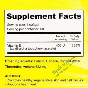 - Vitamin E (as dl-alpha tocopheryl acetate): 400 IU