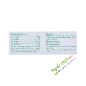 - Phụ liệu : Lecithin, sáp ong trắng, dầu cọ, dầu đậu nành, gelatin, sorbitol 70%, glycerin, vanilin, methyl paraben, propyl paraben, titan dioxyd, màu xanh Brilliant, màu tartrazin tan, nước RO vừa đủ 324 mg.
